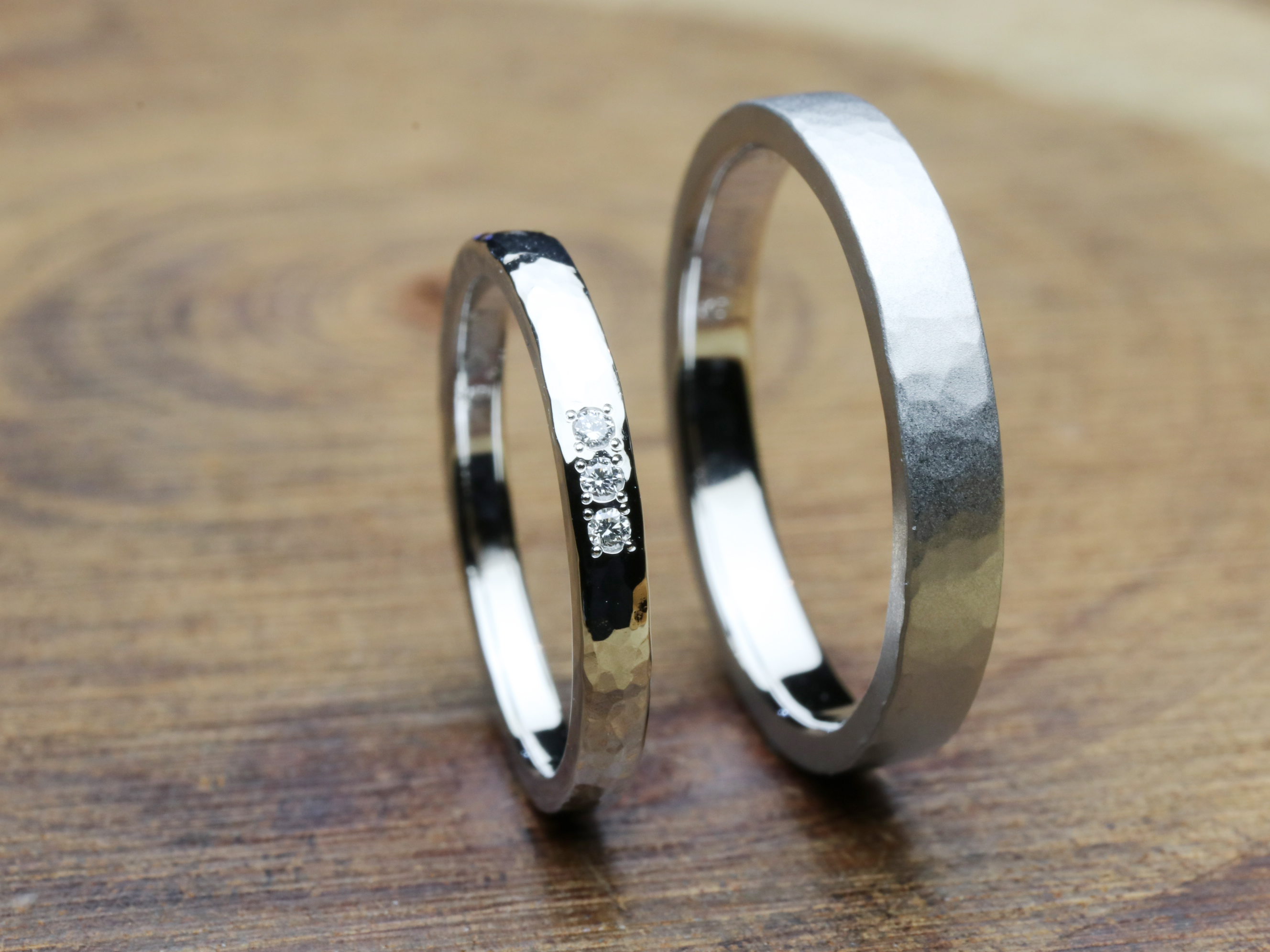 最終的に旦那さんはマット加工(つや消し)・奥さんはダイヤ3石留めの加工をして完成です!