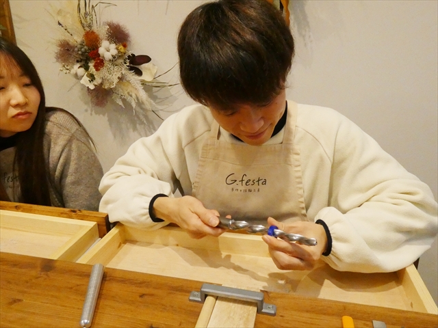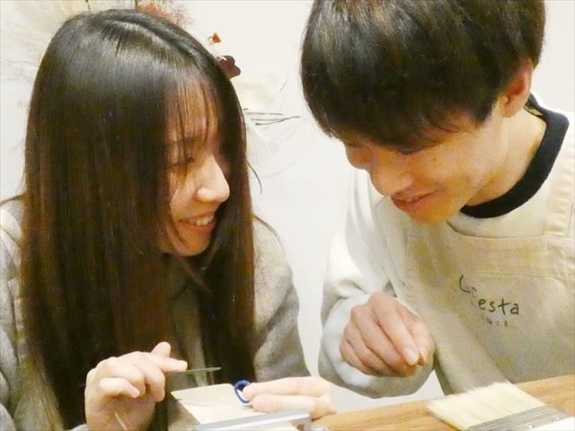 彼女は指輪をウェーブの形に削り出す作業へ、彼はクロスデザインにするための工程に進みます