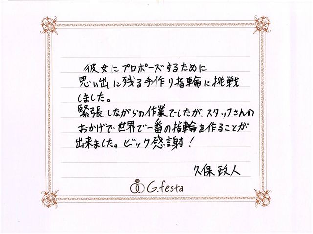 静岡県浜松市 Mさん (浜松店/婚約指輪) ▲ 感想を読む DATA コース 婚約指輪 デザイン ストレート 店舗 浜松店 制作時間 2時間 素材 Pt900 リング幅 2.0mm オプション 表面:ダイヤモンドセッティング