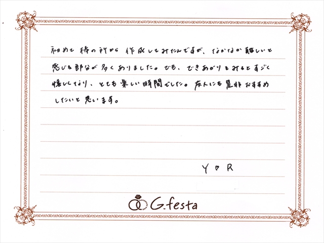 愛知県一宮市 Yさん・Rさん (岐阜本店/結婚指輪・彫金) ▲ 感想を読む DATA コース 結婚指輪(彫金) デザイン ストレート 店舗 岐阜本店 制作時間 1時間半 素材 K18WG リング幅 2.0mm/2.5mm オプション 内面:誕生石セッティング