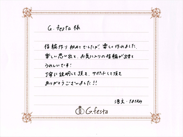 愛知県名古屋市 Hさん・Nさん (名古屋店/結婚指輪・彫金) ▲ 感想を読む DATA コース 結婚指輪(彫金) デザイン ストレート 店舗 名古屋店 制作時間 2時間 素材 K18YG リング幅 2.5mm オプション 表面:ダイヤモンドセッティング/内面:誕生石セッティング