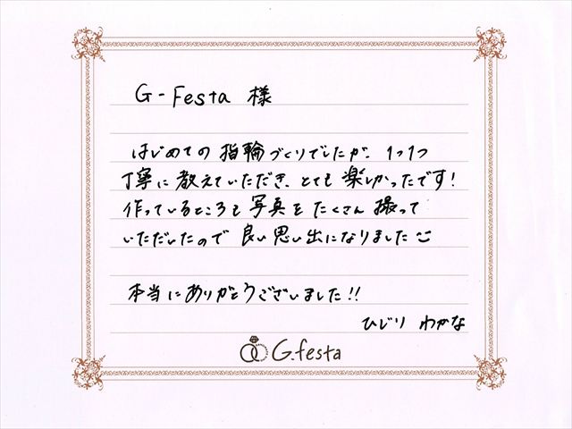 静岡県焼津市 Hさん・Wさん (浜松店/結婚指輪・彫金) ▲ 感想を読む DATA コース 結婚指輪(彫金) デザイン ツイスト 店舗 浜松店 制作時間 1時間半 素材 K18PG/Pt900 リング幅 2.0mm/2.5mm オプション 表面:ダイヤモンドセッティング 内面:誕生石セッティング