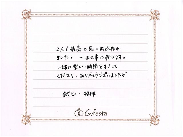 愛知県安城市 Sさん・Sさん (名古屋店/結婚指輪・彫金) ▲ 感想を読む DATA コース 結婚指輪(彫金) デザイン ストレート 店舗 名古屋店 制作時間 1時間半 素材 Pt900/Pt900 リング幅 2.5mm/3.0mm