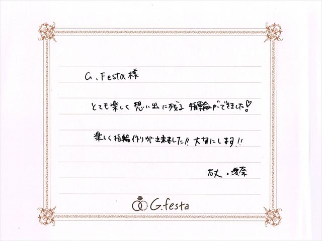 愛知県知多市 Bさん・Rさん (名古屋店/結婚指輪・彫金) ▲ 感想を読む DATA コース 結婚指輪(彫金) デザイン ふたり結びコンビネーション 店舗 名古屋店 制作時間 2時間 素材 Pt900 K18PG/Pt900 リング幅 2.0mm×2.0mm/2.0mm オプション 表面:ダイヤモンドセッティング