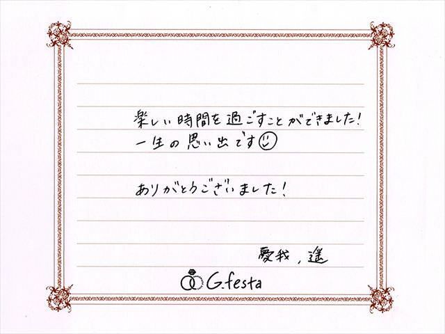 愛知県一宮市 Yさん・Hさん (岐阜本店/結婚指輪・彫金) ▲ 感想を読む DATA コース 結婚指輪(彫金) デザイン つち目 店舗 岐阜本店 制作時間 1時間半 素材 Pt900/Pt900 リング幅 3.0mm/3.0mm オプション 内面:誕生石セッティング