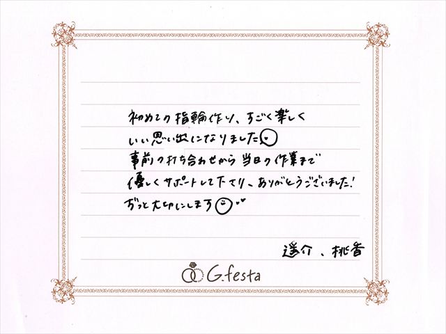 愛知県名古屋市 Yさん・Mさん (名古屋店/結婚指輪・彫金) ▲ 感想を読む DATA コース 結婚指輪(彫金) デザイン ツイスト 店舗 名古屋店 制作時間 2時間 素材 Pt900/Pt900 リング幅 2.0mm/2.0mm オプション 表面:ダイヤモンドセッティング 内面:誕生石セッティング