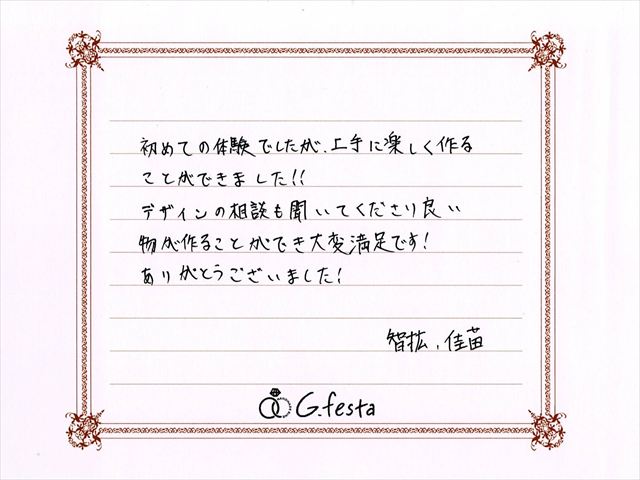 岐阜県大垣市 Tさん・Kさん (岐阜本店/結婚指輪・彫金) ▲ 感想を読む DATA コース 結婚指輪(彫金) デザイン ストレート 店舗 岐阜本店 制作時間 1時間半 素材 PT900/PT900 リング幅 2.0mm/2.5mm オプション 表面:ダイヤモンドセッティング