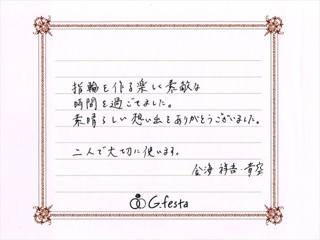 岐阜県岐阜市 Sさん・Sさん (岐阜本店/結婚指輪・彫金) ▲ 感想を読む DATA コース 結婚指輪(彫金) デザイン つち目 店舗 岐阜本店 制作時間 2時間 素材 PT900/PT900 リング幅 2.0mm/3.0mm オプション 表面:ダイヤモンドセッティング