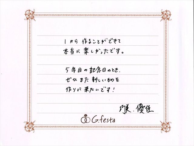 静岡県浜松市 Tさん・Yさん (浜松店/結婚指輪・彫金) ▲ 感想を読む DATA コース 結婚指輪(彫金) デザイン ツイスト 店舗 浜松店 制作時間 1時間半 素材 PT900/PT900 リング幅 1.5mm/1.5mm