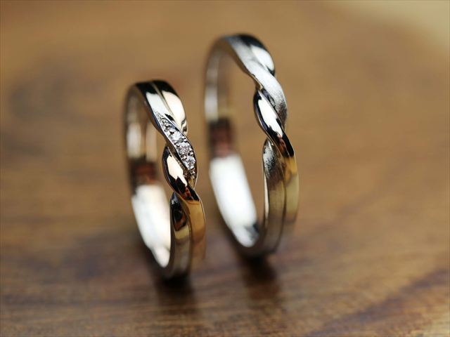 愛知県名古屋市 SさんRさん (名古屋店/結婚指輪・彫金) ▲ 感想を読む DATA コース 結婚指輪(彫金) デザイン ふたり結び 店舗 名古屋店 制作時間 2時間 素材 Pt900 K18PG/Pt900 オプション 表面:ダイヤモンドセッティング