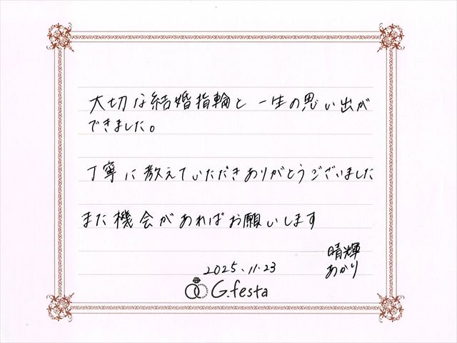 三重県四日市市 HさんAさん (三重店/結婚指輪・彫金) ▲ 感想を読む DATA コース 結婚指輪(彫金) デザイン ストレートツイスト 店舗 三重店 制作時間 1時間半 素材 Pt900/Pt900 リング幅 2.0mm/2.0mm オプション 表面:ダイヤモンドセッティング