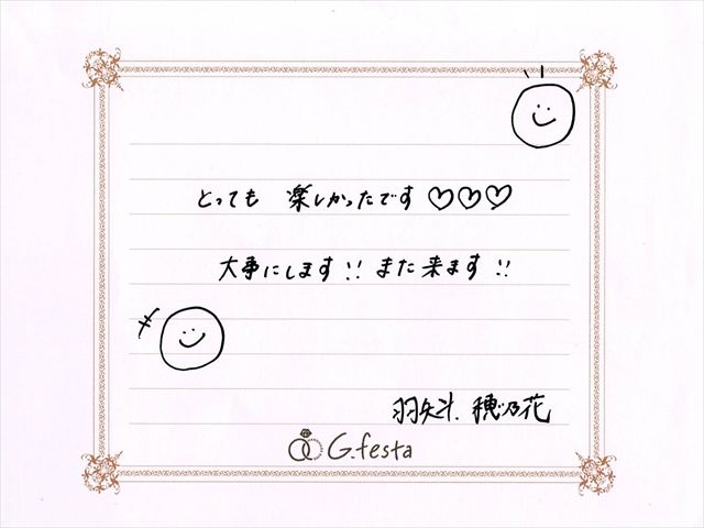 愛知県名古屋市 HさんHさん (名古屋店/結婚指輪・彫金) ▲ 感想を読む DATA コース 結婚指輪(彫金) デザイン ストレート 店舗 名古屋店 制作時間 1時間半 素材 K18YG/Pt900 リング幅 2.0mm/2.5mm
