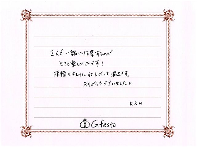 岐阜県岐阜市 Kさん・Mさん (岐阜本店/結婚指輪・彫金) ▲ 感想を読む DATA コース 結婚指輪(彫金) デザイン ツイスト 店舗 岐阜本店 制作時間 1時間半 素材 Pt900/Pt900 リング幅 2.5mm/2.5mm