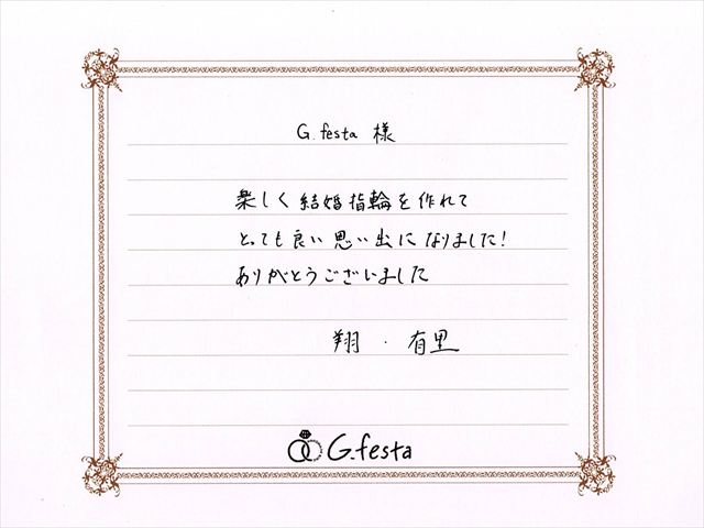岐阜県大垣市 Sさん・Yさん (岐阜本店/結婚指輪・彫金) ▲ 感想を読む DATA コース 結婚指輪(彫金) デザイン ストレート 店舗 岐阜本店 制作時間 2時間 素材 Pt900/Pt900 リング幅 2.5mm/2.5mm オプション 表面:ダイヤモンドセッティング 内面:誕生石セッティング