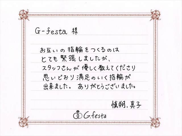 三重県度会郡 Sさん・Mさん (三重店/結婚指輪・彫金) ▲ 感想を読む DATA コース 結婚指輪(彫金) デザイン ストレート 店舗 三重店 制作時間 1時間半 素材 PT900/PT900 リング幅 2.0mm/2.5mm