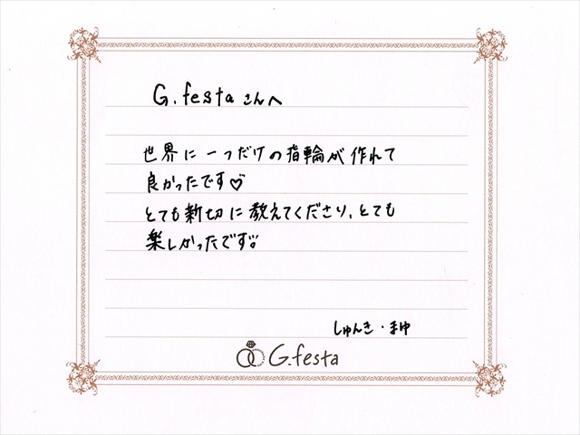愛知県北名古屋市 Sさん・Mさん (名古屋店/結婚指輪・彫金) ▲ 感想を読む DATA コース 結婚指輪(彫金) デザイン つち目 店舗 名古屋店 制作時間 1時間半 素材 K18YG/K18YG リング幅 2.0mm/3.0mm