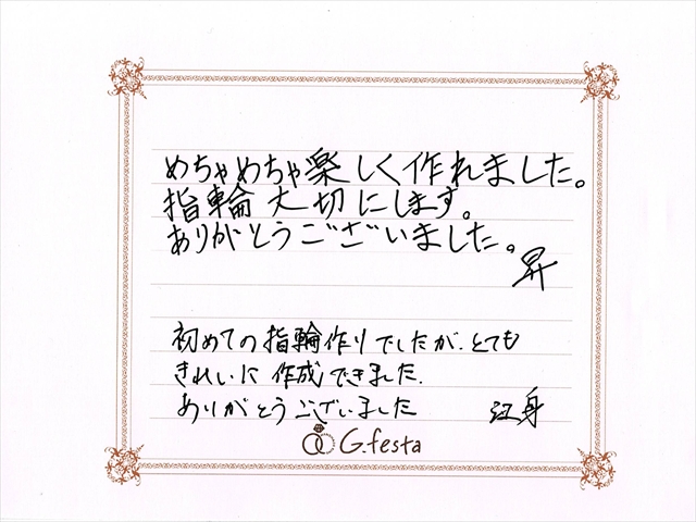 静岡県御前崎市 Nさん・Eさん (浜松店/結婚指輪・彫金) ▲ 感想を読む DATA コース 結婚指輪(彫金) デザイン つち目 店舗 浜松店 制作時間 2時間 素材 Pt900/Pt900 リング幅 2.0mm/2.0mm