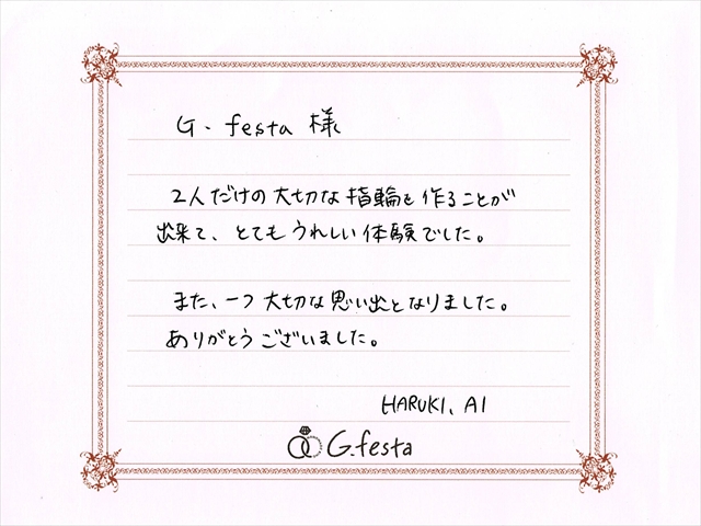 三重県四日市市 Hさん・Aさん (三重店/結婚指輪・彫金) ▲ 感想を読む DATA コース 結婚指輪(彫金) デザイン ストレート 店舗 三重店 制作時間 2時間 素材 Pt900/Pt900 リング幅 2.0mm/2.0mm オプション 表面:レーザー刻印