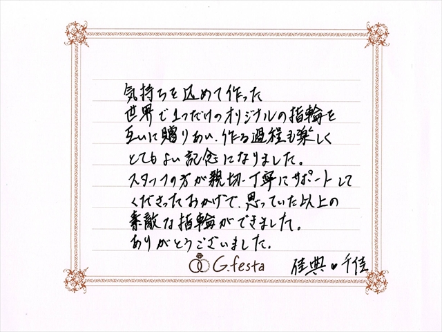 静岡県周智郡 Yさん・Cさん (浜松店/結婚指輪・彫金) ▲ 感想を読む DATA コース 結婚指輪(彫金) デザイン つち目 店舗 浜松店 制作時間 2時間半 素材 K18PG/K18PG リング幅 2.0mm/2.5mm オプション 表面:ダイヤモンドセッティング