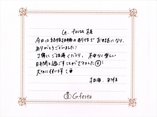 愛知県名古屋市 Tさん・Aさん (名古屋店/結婚指輪・彫金) ▲ 感想を読む DATA コース 結婚指輪(彫金) デザイン ストレート 店舗 名古屋店 制作時間 2時間 素材 K18PG/Pt900 リング幅 2.0mm/2.0mm