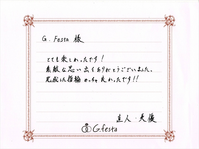 三重県伊賀市 Nさん・Mさん (三重店/結婚指輪・彫金) ▲ 感想を読む DATA コース 結婚指輪(彫金) デザイン ストレート 店舗 三重店 制作時間 2時間 素材 Pt900/Pt900 リング幅 2.0mm/2.5mm