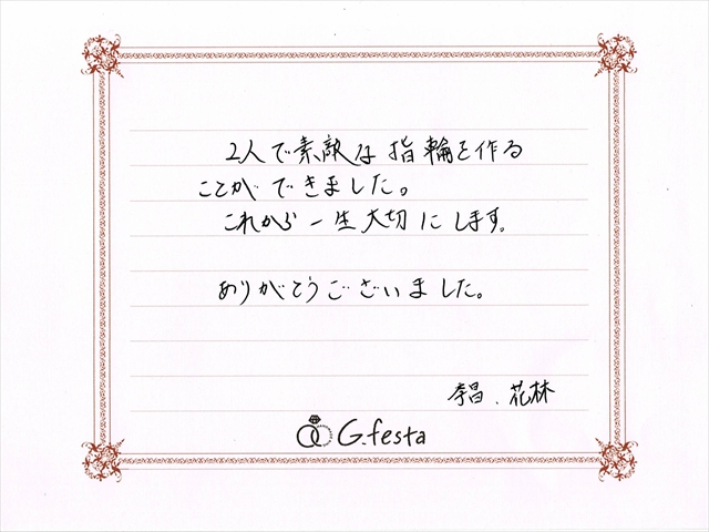 三重県津市 Kさん・Kさん (三重店/結婚指輪・彫金) ▲ 感想を読む DATA コース 結婚指輪(彫金) デザイン ストレート 店舗 三重店 制作時間 2時間 素材 Pt900/Pt900 リング幅 2.5mm/2.5mm オプション 表面:ダイヤモンドセッティング 内面:誕生石セッティング