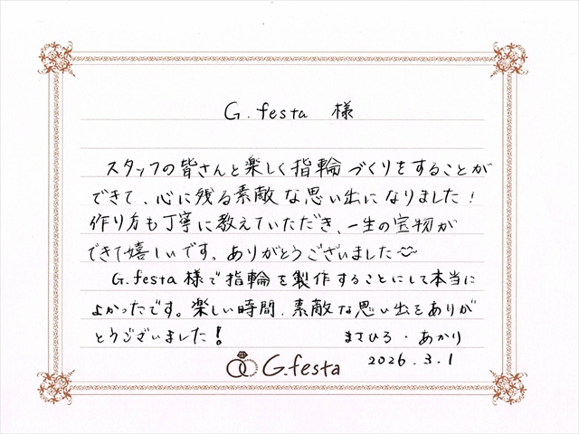 静岡県浜松市 Mさん・Aさん (浜松店/結婚指輪・彫金) ▲ 感想を読む DATA コース 結婚指輪(彫金) デザイン ストレート 店舗 浜松店 制作時間 2時間半 素材 K18PG/K18WG リング幅 2.0mm/2.0mm オプション 表面:ダイヤモンドセッティング