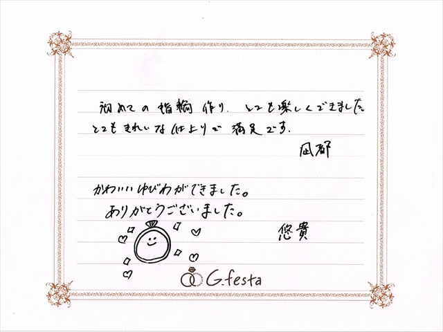 静岡県浜松市 Nさん・Yさん (浜松店/結婚指輪・彫金) ▲ 感想を読む DATA コース 結婚指輪(彫金) デザイン ストレート 店舗 浜松店 制作時間 1時間半 素材 K18YG/Pt900 リング幅 2.0mm/2.5mm オプション 表面:ダイヤモンドセッティング