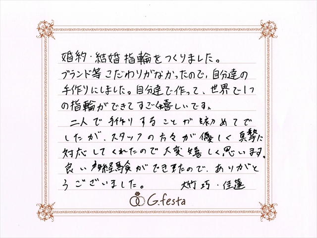 愛知県安城市 Tさん・Kさん (岡崎店/婚約指輪) ▲ 感想を読む DATA コース 結婚指輪(彫金)婚約指輪 デザイン ストレートつち目 店舗 岡崎店 制作時間 2時間 素材 EG Pt900 MR Pt900/Pt900 リング幅 2.0mm/2.0mm オプション 内面:誕生石セッティング