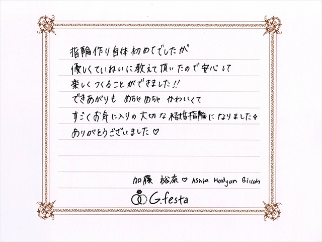 岐阜県関市 Aさん・Yさん (岐阜本店/結婚指輪・彫金) ▲ 感想を読む DATA コース 結婚指輪(彫金) デザイン つち目 店舗 岐阜本店 制作時間 1時間半 素材 K18PG/K18PG リング幅 1.5mm/2.0mm オプション 表面:ダイヤモンドセッティング