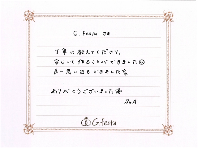 愛知県名古屋市 Sさん・Aさん (名古屋店/結婚指輪・彫金) ▲ 感想を読む DATA コース 結婚指輪(彫金) デザイン つち目 店舗 名古屋店 制作時間 2時間 素材 Pt900/Pt900 リング幅 2.0mm/2.0mm オプション 表面:ダイヤモンドセッティング