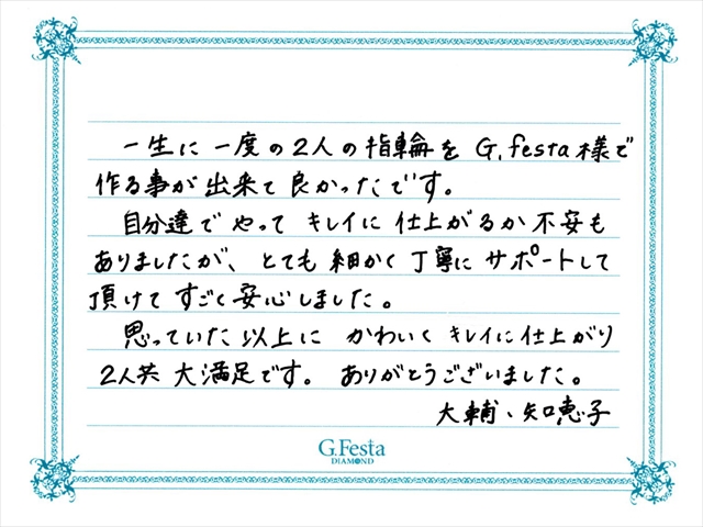 三重県津市 Dさん・Cさん (三重店/結婚指輪・ワックス) ▲ 感想を読む DATA コース 結婚指輪(ワックス) デザイン ストレート 店舗 三重店 制作時間 2時間 素材 プラチナ リング幅 2.3mm/2.8mm オプション 表面:ダイヤモンドセッティング、内面:誕生石セッティング