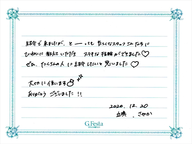 愛知県刈谷市 Tさん・Sさん (名古屋店/結婚指輪・ワックス) ▲ 感想を読む DATA コース 結婚指輪(ワックス) デザイン ウェーブ 店舗 名古屋店 制作時間 1時間半 素材 プラチナ リング幅 2.3mm/2.7mm オプション 表面:ダイヤモンドセッティング