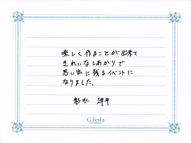 愛知県名古屋市 Yさん・Aさん (名古屋店/結婚指輪・ワックス) ▲ 感想を読む DATA コース 結婚指輪(ワックス) デザイン ストレートつち目 店舗 名古屋店 制作時間 2時間半 素材 K18PG/プラチナ リング幅 2.8mm オプション 表面:ダイヤモンドセッティング、内面:誕生石セッティング