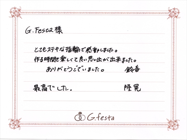 愛知県名古屋市 Tさん・Sさん (名古屋店/結婚指輪・ワックス) ▲ 感想を読む DATA コース 結婚指輪(ワックス) デザイン ストレート 店舗 名古屋店 制作時間 2時間 素材 プラチナ リング幅 2.5mm/2.8mm オプション 表面:ダイヤモンドセッティング、内面:誕生石セッティング