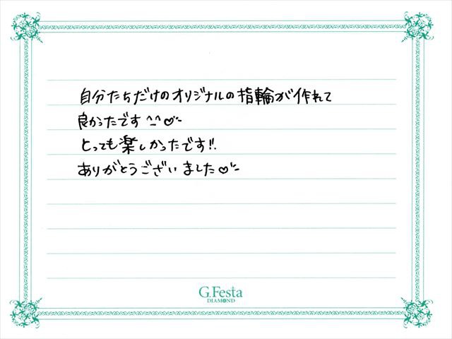 三重県鈴鹿市 Sさん・Rさん (三重店/結婚指輪・ワックス) ▲ 感想を読む DATA コース 結婚指輪(ワックス) デザイン クロス 店舗 三重店 制作時間 2時間 素材 プラチナ オプション 表面:ダイヤモンドセッティング 内面:誕生石セッティング