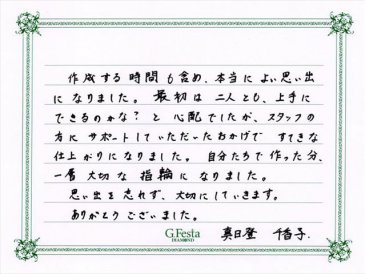 千葉県浦安市 Mさん・Cさん (名古屋店/結婚指輪・ワックス) ▲ 感想を読む DATA コース 結婚指輪(ワックス) デザイン 多面体 店舗 名古屋店 制作時間 2時間 素材 プラチナ リング幅 2.5mm オプション 内面:誕生石セッティング