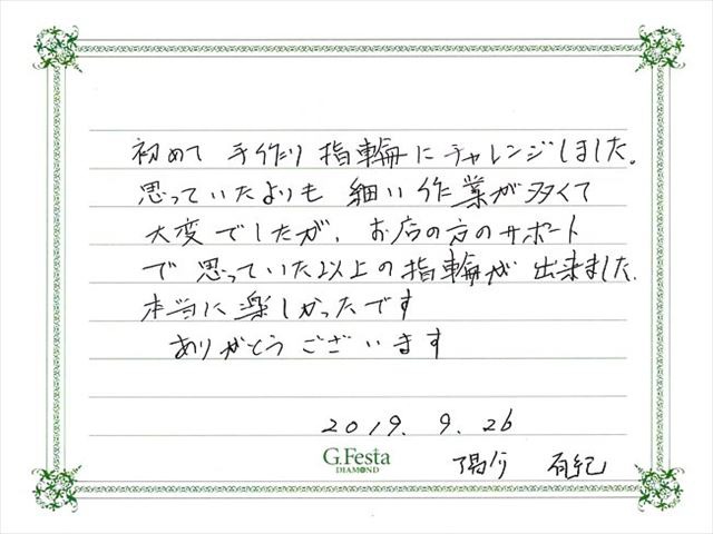 愛知県あま市 Yさん・Yさん (名古屋店/結婚指輪・ワックス) ▲ 感想を読む DATA コース 結婚指輪(ワックス) デザイン つち目 店舗 名古屋店 制作時間 2時間半 素材 K18PG リング幅 2.5mm/3.2mm オプション 表面:ダイヤモンドセッティング 内面:誕生石セッティング