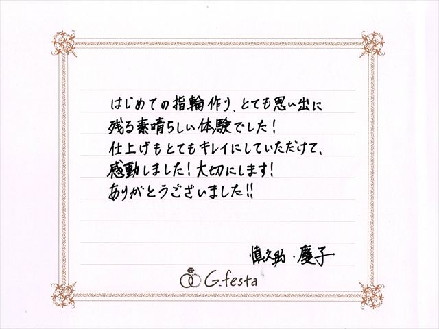 愛知県名古屋市 Sさん・Kさん (名古屋店/結婚指輪・ワックス) ▲ 感想を読む DATA コース 結婚指輪(ワックス) デザイン つち目 店舗 名古屋店 制作時間 2時間半 素材 Pt900/Pt900 リング幅 2.0mm/3.0mm オプション 表面:ダイヤモンドセッティング 内面:誕生石セッティング