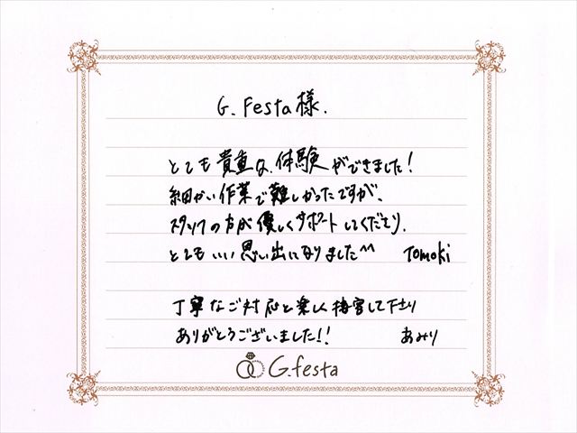 愛知県海部郡 Tさん・Aさん (名古屋店/結婚指輪・ワックス) ▲ 感想を読む DATA コース 結婚指輪(ワックス) デザイン 多面体 店舗 名古屋店 制作時間 2時間 素材 Pt900/Pt900 リング幅 2.5mm/3.0mm オプション 表面:ダイヤモンドセッティング 内面:誕生石セッティング