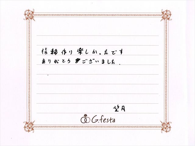 静岡県静岡市 Eさん・Sさん (浜松店/結婚指輪・ワックス) ▲ 感想を読む DATA コース 結婚指輪(ワックス) デザイン つち目 店舗 浜松店 制作時間 2時間 素材 K18YG/Pt900 リング幅 2.0mm/2.5mm オプション 表面:ダイヤモンドセッティング 内面:誕生石セッティング
