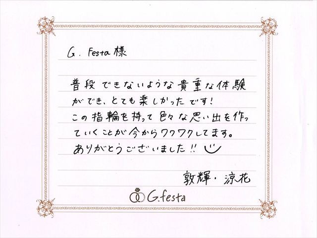 愛知県稲沢市 Aさん・Sさん (名古屋店/結婚指輪・ワックス) ▲ 感想を読む DATA コース 結婚指輪(ワックス) デザイン ウェーブ 店舗 名古屋店 制作時間 1時間半 素材 Pt900/Pt900 リング幅 2.5mm/3.0mm オプション 表面:ダイヤモンドセッティング