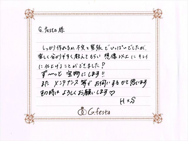 静岡県磐田市 Hさん・Sさん (浜松店/結婚指輪・ワックス) ▲ 感想を読む DATA コース 結婚指輪(ワックス) デザイン V字 店舗 浜松店 制作時間 1時間半 素材 Pt900 K18PG/Pt900 リング幅 2.0mm/3.0mm オプション 内面:誕生石セッティング