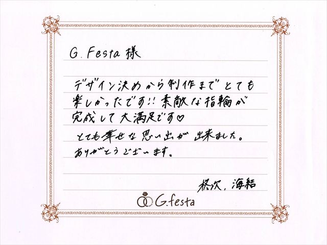 静岡県浜松市 Sさん・Mさん (浜松店/結婚指輪・ワックス) ▲ 感想を読む DATA コース 結婚指輪(ワックス) デザイン ウェーブ 店舗 浜松店 制作時間 2時間 素材 K18YG/K18YG リング幅 2.3mm/2.8mm オプション 表面:ダイヤモンドセッティング