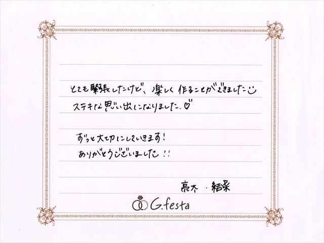 千葉県千葉市 Rさん・Yさん (浜松店/結婚指輪・ワックス) ▲ 感想を読む DATA コース 結婚指輪(ワックス) デザイン つち目コンビネーション 店舗 浜松店 制作時間 2時間 素材 Pt900 K18PG/Pt900 K18YG リング幅 2.7mm/3.0mm オプション 内面:誕生石セッティング