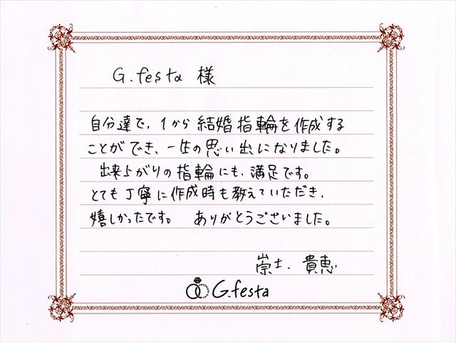 岐阜県岐阜市 Tさん・Kさん (岐阜本店/結婚指輪・ワックス) ▲ 感想を読む DATA コース 結婚指輪(ワックス) デザイン ウェーブつち目 店舗 岐阜本店 制作時間 2時間 素材 K18WG/K18WG リング幅 3.0mm/3.0mm オプション 表面:ダイヤモンドセッティング