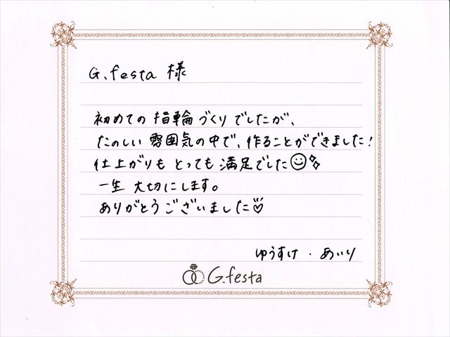 愛知県名古屋市 YさんAさん (名古屋店/結婚指輪・ワックス) ▲ 感想を読む DATA コース 結婚指輪(ワックス) デザイン つち目 店舗 名古屋店 制作時間 2時間 素材 K18PG/K18YG リング幅 2.5mm/3.0mm オプション 表面:ダイヤモンドセッティング 内面:誕生石セッティング