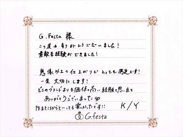 静岡県浜松市 KさんYさん (浜松店/結婚指輪・ワックス) ▲ 感想を読む DATA コース 結婚指輪(ワックス) デザイン クロス 店舗 浜松店 制作時間 2時間 素材 Pt900/Pt900 リング幅 2.5mm/3.5mm オプション 表面:ダイヤモンドセッティング
