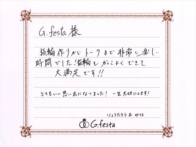 岐阜県高山市 RさんYさん (岐阜本店/結婚指輪・ワックス) ▲ 感想を読む DATA コース 結婚指輪(ワックス) デザイン つち目 店舗 岐阜本店 制作時間 1時間半 素材 Pt900/Pt900 リング幅 2.6mm/3.0mm