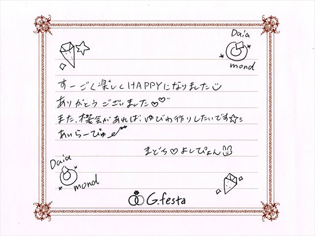 愛知県一宮市 Yさん・Mさん (岐阜本店/結婚指輪・ワックス) ▲ 感想を読む DATA コース 結婚指輪(ワックス) デザイン ウェーブコンビネーション 店舗 岐阜本店 制作時間 2時間 素材 Pt900 K18YG/Pt900 リング幅 2.5mm/2.5mm オプション 表面:ダイヤモンドセッティング